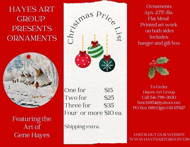 Welcome to HayesArtGroup.com, featuring Western, wildlife and scenic note cards reproduced from original paintings by northeastern Oregon artist Eugene B. Hayes. Themes for the note cards include Oregon Trail, Log Cabin, Horse Logging, Mules, Mountain Men, Country Schools, Native American, Wildlife in Winter, and Winter Scenes. Also available are 3 books featuring the artwork of Mr. Hayes: